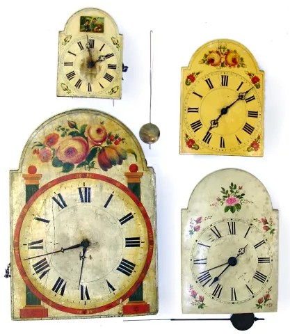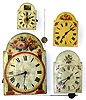 Four Black Forest shield front weight driven wall clocks. Brightly painted dials, wood plate movements, two have bells on top. Smallest with cute little painting of shepherds is 8" high. Largest, with bold columns and flowers, is 18" high.