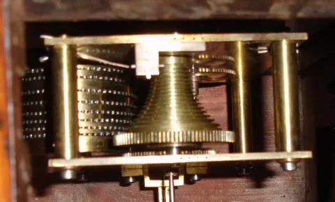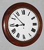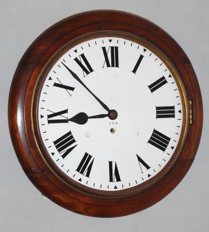 English dial wall clock 8 day time only spring driven movement with fusee in walnut case, c1900 This clock has a refinished case and repainted G.P.O. dial (small circular cracking around dial posts), and is missing its glass. The chain-driven movement, complete with correct pendulum, looks clean. 15" overall diameter.
