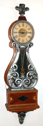 Modern lyre presentation wall clock in impressive full size case. Clock has silvery cast metal front, bezel, bottom, and finial, dial inscription "Virginia P. Timmans, Southwestern Chapter 15, NAWCC 1968", c1968 Interesting modern clock with impressive look. One similar has sold recently on eBay for $800. 43"H