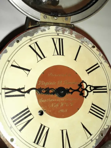 Modern lyre presentation wall clock in impressive full size case. Clock has silvery cast metal front, bezel, bottom, and finial, dial inscription "Virginia P. Timmans, Southwestern Chapter 15, NAWCC 1968", c1968