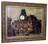 colorful framed print of European riverfront town, 2.5" clock face mounted in tower image. Porcelain dial, old movement not examined out of frame. Carved painted frame 24" x 20.5", black rear wooden box is 2.5" deep.
