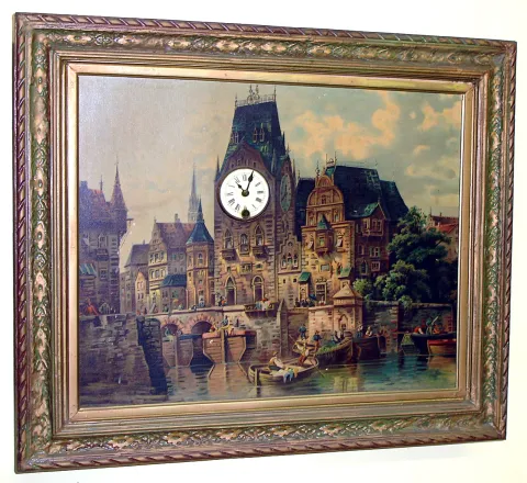 Picture Clock, Continental with spring driven time only movement, c1880 colorful framed print of European riverfront town, 2.5" clock face mounted in tower image. Porcelain dial, old movement not examined out of frame. Carved painted frame 24" x 20.5", black rear wooden box is 2.5" deep.