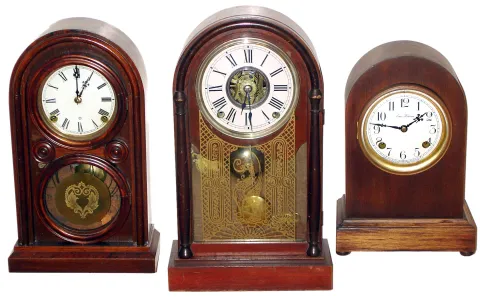 Three Connecticut 8 day time and strike mahogany round top mantel clocks.