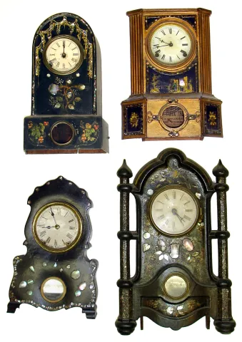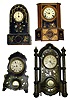 Four 8-day Connecticut iron front clocks. MOP-inlay, decorative and mostly intact cases and movements. Very restorable.
