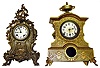 Two Connecticut heavy cast-metal 8 day mantel clocks. Shorter is New Haven with enamel dial and beveled glass. Larger gold urn top is 20" high.