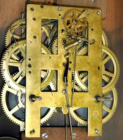 Anglo American inlaid wall clock, New Haven 8 day movement, c1890.