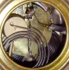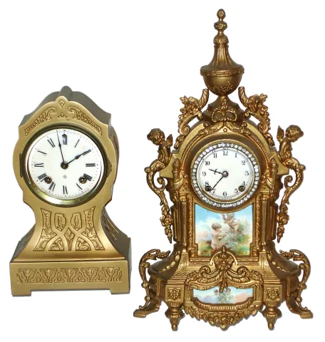 both beautifully restored gold finish cast metal case with near perfect porcelain dials. Larger is New Haven "Lakeside" with decorated porcelain panel...