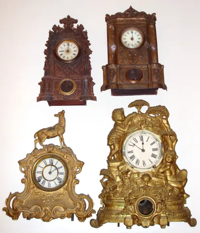 Four 8-day American iron fronts 2 gold figurals, 1 with U.S. Clock Co. dial in N. Muller No. 21 case. Largest is 20" high.