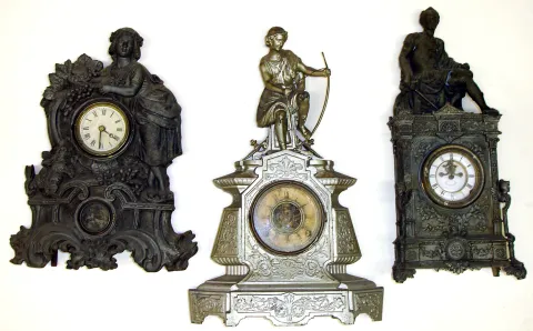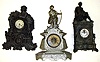 Three Connecticut 8 day cast metal and wood figural mantel clocks- there are two seated men with weapons and a Muller No. 67 with a standing peasant woman with fruit and rabbits, tallest is 23" high