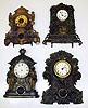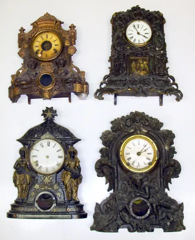 Four Connecticut 8-day iron fronts Detailed figures. One with James Wood and Co. rear label, largest with J.J.Beals and Son, Boston dial is 18" high.