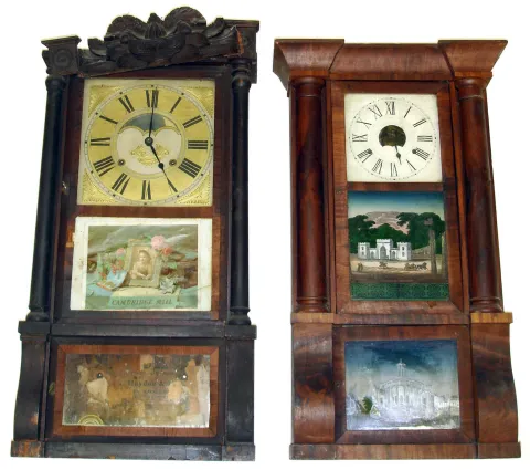 Two 8 day weight driven shelf clocks. Cornice top is Birge and Peck with partial train label and two nice glasses (although upper Baltimore Cemetery tablet probably newer). Carved top is by Peck and Hayden, St. Louis, Missouri, nice gold dial and mirror