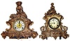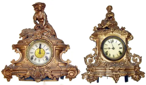 Two Connecticut 8 day gold figural mantel clocks. Includes "Reaper" model seen in Mathew Brady portrait photos. Both 18" tall.