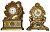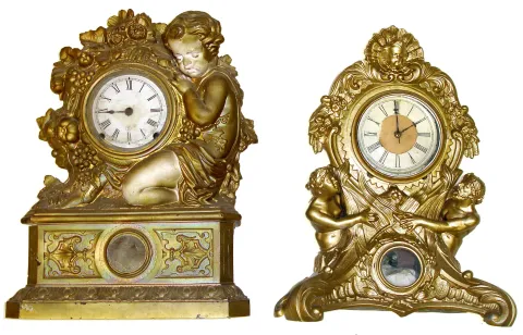 Two large gold 8 day Connecticut figural mantel clocks. Largest, with bold child, is 19" high.