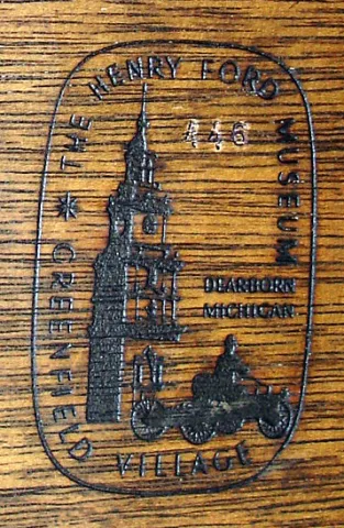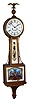 antique gold painted front. Brass finial, side arms and bezel. German spring wound pendulum movement. Painted lower "Hull" tablet shows Constitution and Gueriere. Sold by Henry Ford Museum (brand on back) for $750 in 1999. Ht 44"
