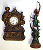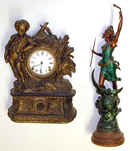 Two cast metal figurals including one complete clock and one swinger statue only, c.1880. Clock, with standing lad, fish, etc. has 8 day striking Connecticut movement and replaced paper dial. Standing spear toting lady has old green and gold paint,