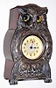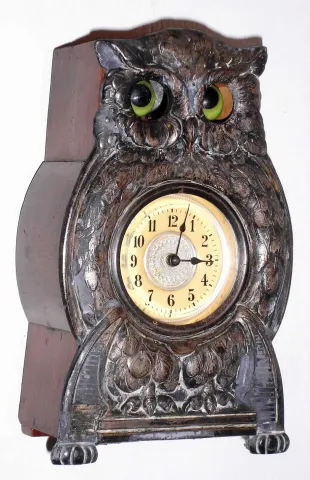 Owl novelty clock German or Swiss with moving eyes and cast white metal front inset with Arabic numeral dial all on wooden housing for movement, c1920