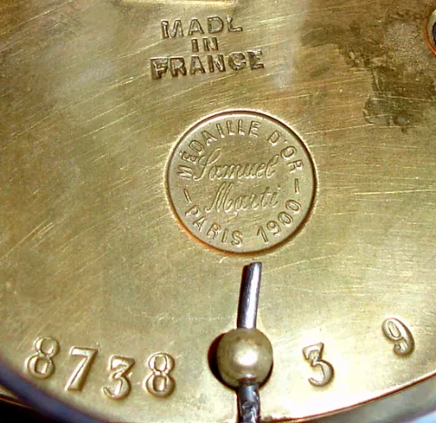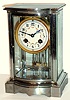 French, Marti and Cie, crystal regulator with 8 day time and strike spring driven movement, c1900 unusual nickel plated case is in nice condition with just a little wear on one spot on the front of the base. Original white enamel dial is perfect and the hands are original. One of the side beveled glasses has a chipped piece that was reglued. Back glass is flat and may have originally been beveled. The two remaining panels are fine. Movement is signed. Ht 8.75"