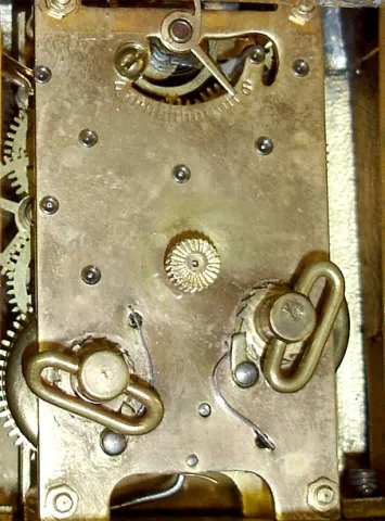 Two brass carriage clocks, French and Jennings Bros., c1910. French is standard model with good beveled glass all around, time only H and H 8 day movement with cylinder platform, porcelain dial with corner crack and stain at center hole, 6" high. Jennings is ornate gold-plated case, thick beveled front glass, porcelain dial with faint corner crack, 30 hour striking movement, 5.5" high. Both have original patinas, movements that tick but probably need cleaning.