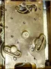 French is standard model with good beveled glass all around, time only H and H 8 day movement with cylinder platform, porcelain dial with corner crack and stain at center hole, 6" high. Jennings is ornate gold-plated case, thick beveled front glass, porcelain dial with faint corner crack, 30 hour striking movement, 5.5" high. Both have original patinas, movements that tick but probably need cleaning.