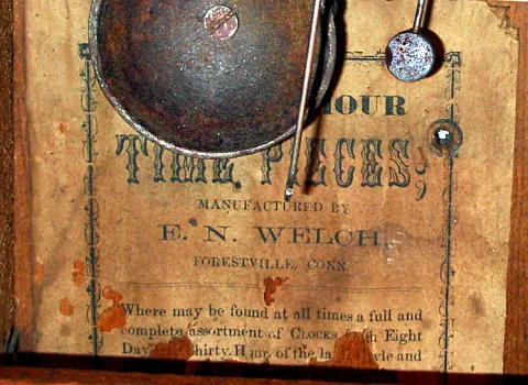 smallest is very cute mahogany time and alarm Ingraham Venetian with green paper label, original round painted tablet is broken but included, 11.5" hi...