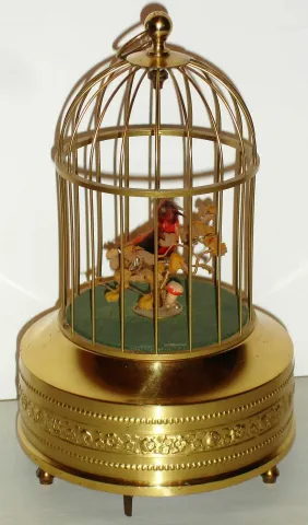 Singing bird single German mechanical with tail and beak motion when singing in gilt cage, c1930 good running order (sings and moves properly) with start, pause and end switch. The gilt is in good condition and the bird and matting need to be cleaned. Ht 10"