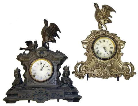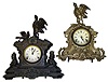 Two Connecticut 8 day bird top cast metal mantel clocks. Detailed heavy fronts and tops with similar bold stance open beak birds. Wooden boxed sides and back. Tallest is 19".