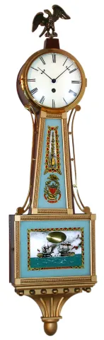 well made case, in near new condition, with polished brass side arms bezel, finial and balls. Lower painted tablet shows Constitution and Guerriere, t...