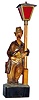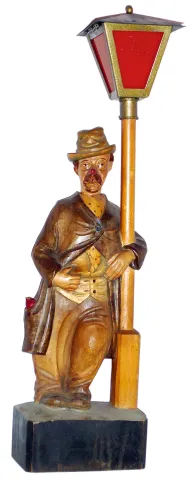 German carved and painted whistler leaning on lamppost with mechanical movement and battery powered lamp, c1930
