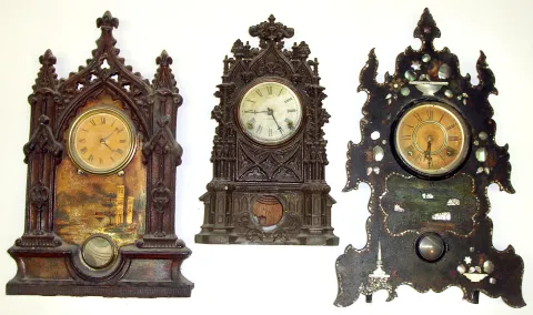 Three large 8-day Connecticut iron fronts Mostly complete cases and movements. Smallest has "C. Jerome" dial.
