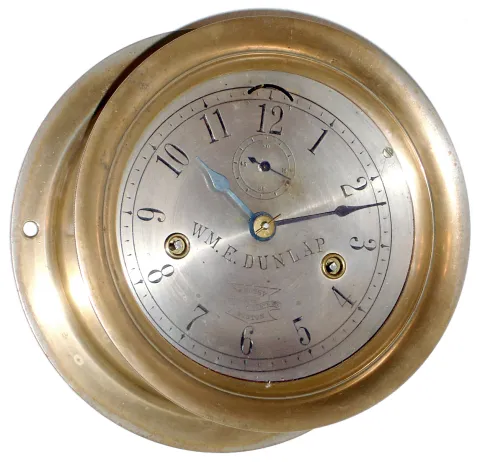 heavy brass case, with old patina and threaded bezel, shows signs of original nickel plating. Silvered dial, signed Wm.E.Dunlap, has seconds bit and j...