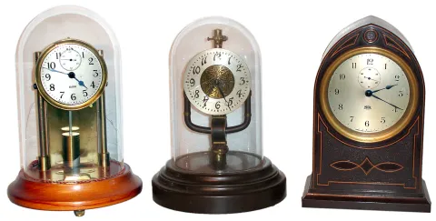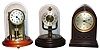 two, Bulle and Barr, are under round glass domes (one dome cracked). Poole is nice wood grained Bakelite beehive case. Overall good condition, movements not tested.
