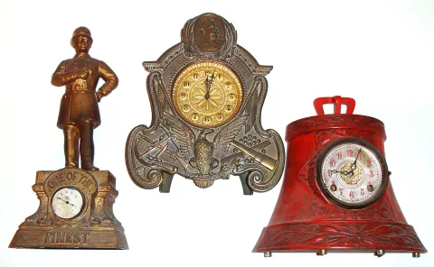 Three commemorative mantel clocks. New Haven red half bell, Waterbury "Dewey" and "One of the Finest" -- tallest at 17".