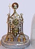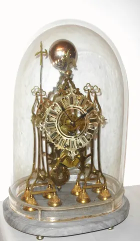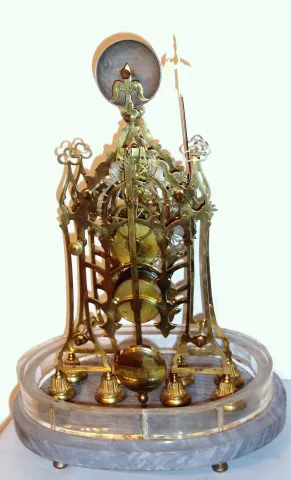 English, Single Fusee skeleton clock with anchor escapement and single passing strike at the hour, the frame resting on 8 cast round feet mounted to a gray marble base, with a 2" plexi-glass spacer added to allow the old glass dome to clear the clock and hammer when striking. overall clean and sound, original chain intact, clock runs briskly and strikes on a bell. Dome has some fly specs; otherwise very good. The silvered dial is cut and fretted and with engraved trim band along the edges; numerals are painted on. Ht of dome = 17.5", overall = 21"