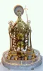 overall clean and sound, original chain intact, clock runs briskly and strikes on a bell. Dome has some fly specs; otherwise very good. The silvered dial is cut and fretted and with engraved trim band along the edges; numerals are painted on. Ht of dome = 17.5", overall = 21"