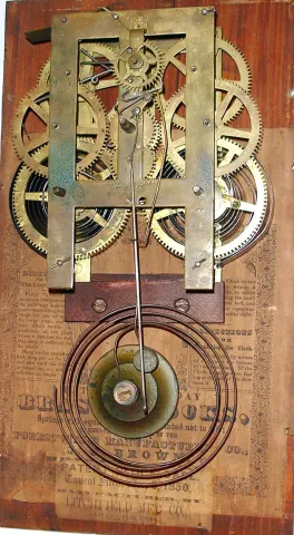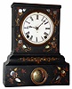 Litchfield Mfg Co., Litchfield, Conn., paper mache case made for J. C. Brown, Forestville, Conn. shelf clock 8 day time and strike spring driven movement with painted metal dial, c1850 the paper mache case is in outstanding original condition with mother of pearl inlays, multicolor floral designs and gold highlights. The case has both Brown and Litchfield labels in excellent condition. Ht 14 1/2"