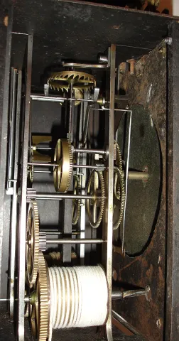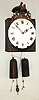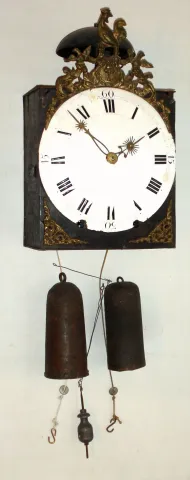rare and early longer running example with crown wheel / verge escapement and "prayer repeat" striking on large bell. Movement looks clean. Enamel dial has some repairs. Nice cast-metal surrounds with crowing rooster on top. Folding pendulum. Note low position of winding arbors. Mr. Cline had this ticking lightly on these small weights, but it would benefit from larger ones. Note great wheel, 2 intermediate arbors, contrate wheel then crown wheel. Ht 17"