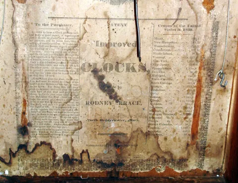 refinished mahogany and mahogany veneered case in nice clean condition. Wooden dial that is most likely original looks to have been repainted. It also has some small metal bars on the back placed there to try a correct a warping problem. Wooden movement has had some bushing work. Mirror in the door is original. Upper glass, while old, is a replacement. Hands look to be original. Nice label inside case with the U.S. Census for 1830. Ht. 23"