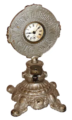 Advertising clock for King Alfred Cigars, standing cast iron cigar cutter inset with 30 hour spring driven movement and papered dial by Waterbury Clock Co., Waterbury, Conn., c1910