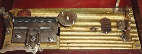 Swiss, "Mira" (div of Mermod Freres, Ste. Croix), disc music box, single comb, with seventeen 9.3 inch discs, C.1895