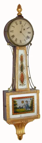 Unsigned Massachusetts banjo timepiece (Willard School), with a step train movement with fillister screw attaching, in a gilt rope front presentation case and with old tablets with pastoral scene. 8-day, weight. C,1830