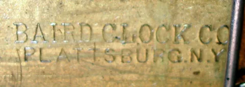 Baird Clock Co., Plattsburgh, New York, advertising wall clock for "NEW YORK CLOTHING HOUSE 102 and 104 E. BALTO. ST. BALTIMORE". The movement is 8 day time only spring driven in a typical Baird paper mache doors and wood body case with papered metal dial