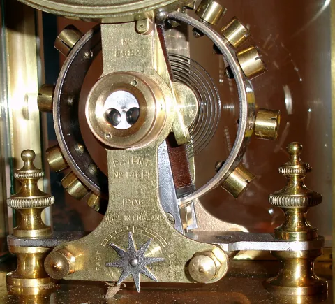 Eureka Clock Co. Ltd., London, England battery powered mantel clock in architectural crystal regulator type case with beveled glass and applied swan and urn decorations in pediment with mechanical movement electrically driven with oversized balance wheel, c1910 the case is starting to oxidize with back door pull replaced with screw. The balance is free. Ht 15"
