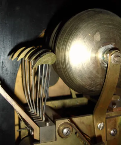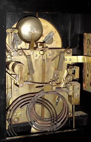 although the gongs and hands have some bits of surface rust, the cast brass trim is still in good condition, and the raised and gilt numerals on the fancy chapter ring are still fine; gilt dial spandrels still bright. There is a split in the case front above 12, some scrapes and loss of finish here and there. The rear bell support has been replaced with a hand made one, quite substantial, and the center of the largest bell has been repaired [rings OK] -(see close image on internet). Overall in good as-found condition, still ticks and tries to chime; will respond to restoration. Ht 27 1/2"