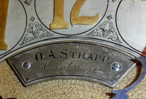 English, triple fusee, quarter chiming bracket clock, in a classic Georgian style large ebonized case with brass caryatids, side frets and pineapple finials, the whole resting on cast "toed" feet, chiming your choice of Whittington on 8 bells or Westminster on 4 large flat wire gongs, and then sounding the hours on a still larger steel flat wire gong, the clock retailed by O. A. Strapp, Cambridge, and with an engraved cartouche below 12 bearing that information, and the arched dial with small subsidiary dials labeled Chime /Silent, F/S, and Chime on 8 Bells or Westminster, C.1875 although the gongs and hands have some bits of surface rust, the cast brass trim is still in good condition, and the raised and gilt numerals on the fancy chapter ring are still fine; gilt dial spandrels still bright. There is a split in the case front above 12, some scrapes and loss of finish here and there. The rear bell support has been replaced with a hand made one, quite substantial, and the center of the largest bell has been repaired [rings OK] -(see close image on internet). Overall in good as-found condition, still ticks and tries to chime; will respond to restoration. Ht 27 1/2"