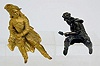 1.) Cavalier with feathered cap, high boots and fancy clothing, seated so his legs dangle down. (Light finish wear on Cavalier.) 2.) King in chain mail armor with crown, holding a spear, seated as if on a horse. 7"