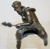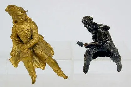 2 Male Metal Clock Statues: Cavalier and King 1.) Cavalier with feathered cap, high boots and fancy clothing, seated so his legs dangle down. (Light finish wear on Cavalier.) 2.) King in chain mail armor with crown, holding a spear, seated as if on a horse. 7"