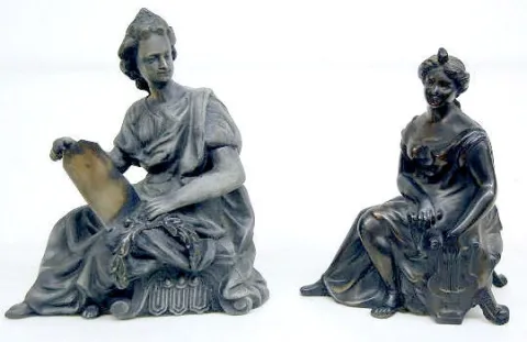 2 Seated Lady Metal Clock Statues 1.) Gilbert Diana 2.) Lady with tablet and 1/2 wreath. Tallest 7 1/2"