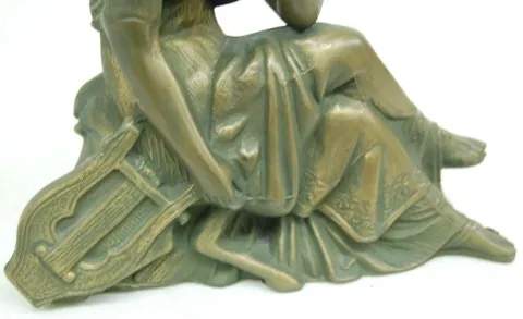 Clock Statue of Lady Sitting W/ Elbow on Knee holding harp; patina green on gold. 8 /2"T