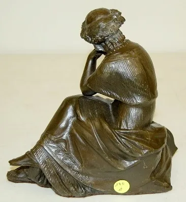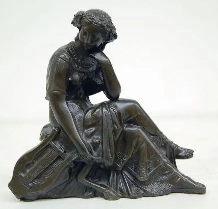 Seated Lady Metal Clock Statue she sits with her elbow resting on her knee and her head in resting on her hand; lyre by her side. 8 3/4"