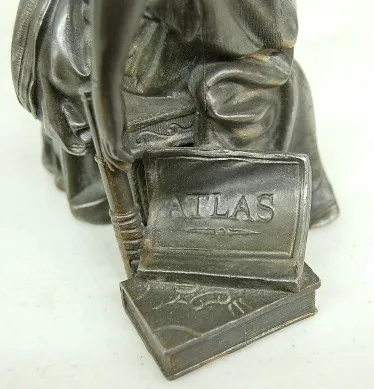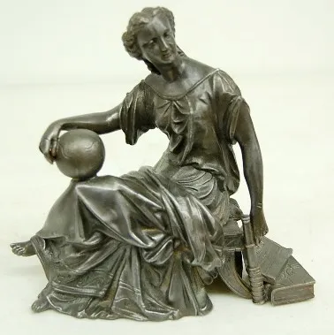 2 Seated Lady Metal Clock Statues 1.) Gilbert Diana 2.) Lady seated with globe, spyglass, Atlas and another book. Tallest 8"